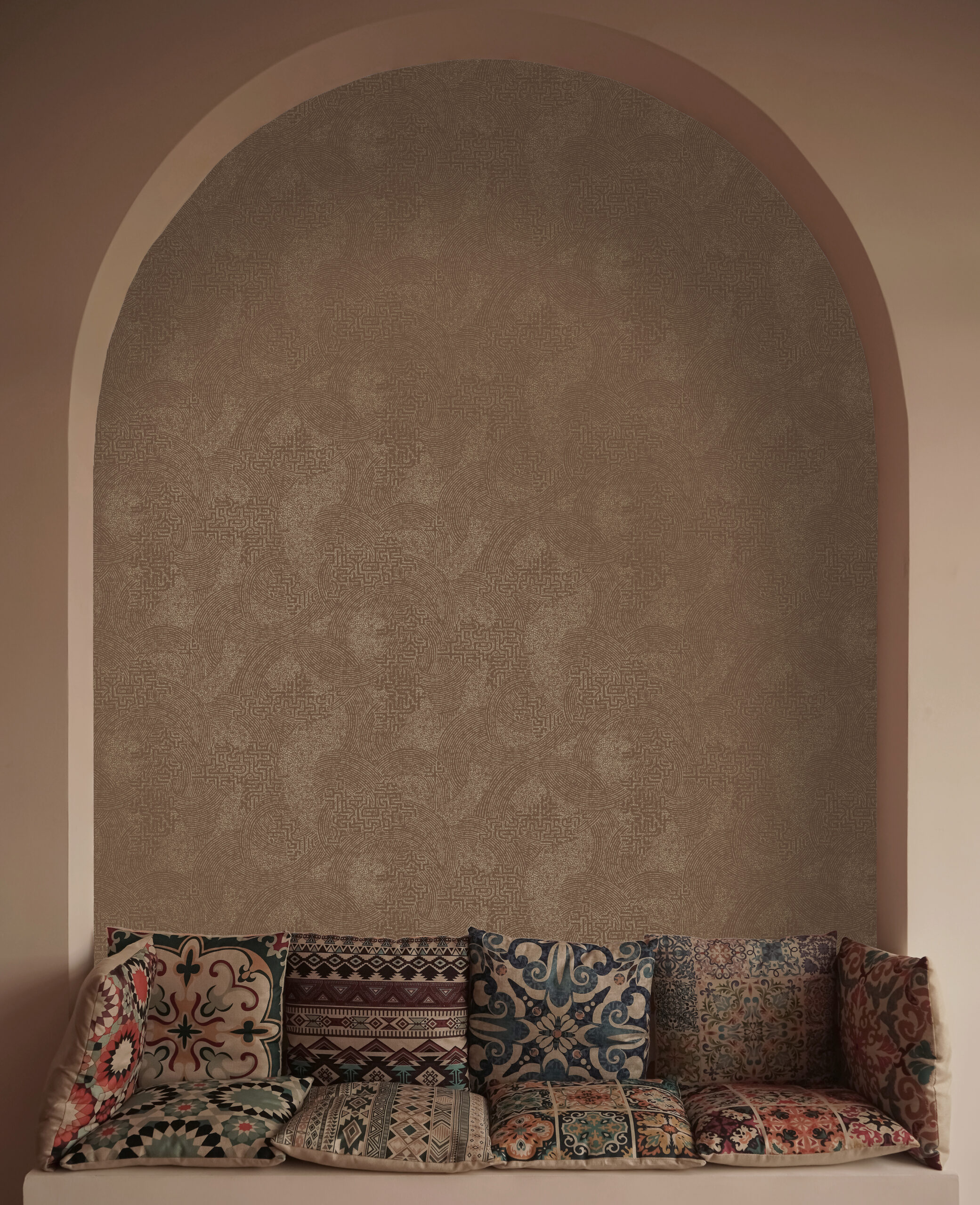 Named after the Eye of the Sahara, a famous geological structure of distressed eroded rings. This wallpaper is created through a fragmented abstract design of intertwined patterns of curved lines, mazes and irregular dots.